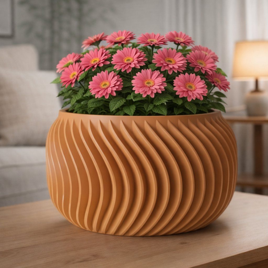 Vilex přináší klidné vlnovkové (helikální) drážkování po celém obvodu. Nízké válcovité tělo s jemně zaoblenými hranami působí harmonicky a nechává vyniknout zeleň – elegantní akcent pro interiér i exteriér.