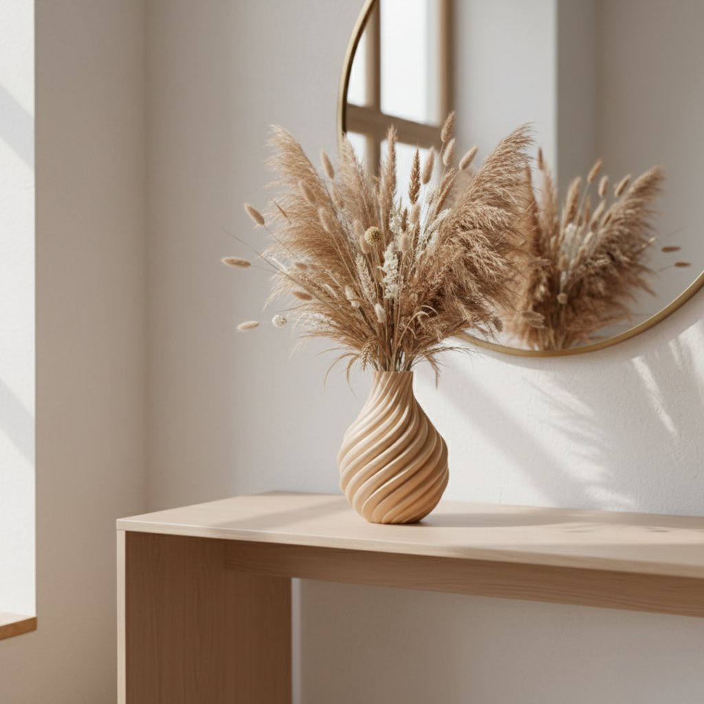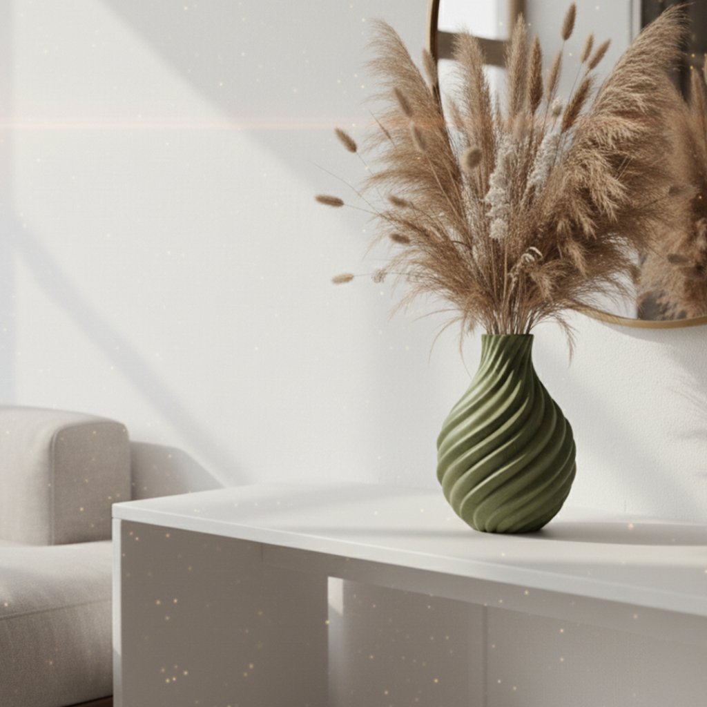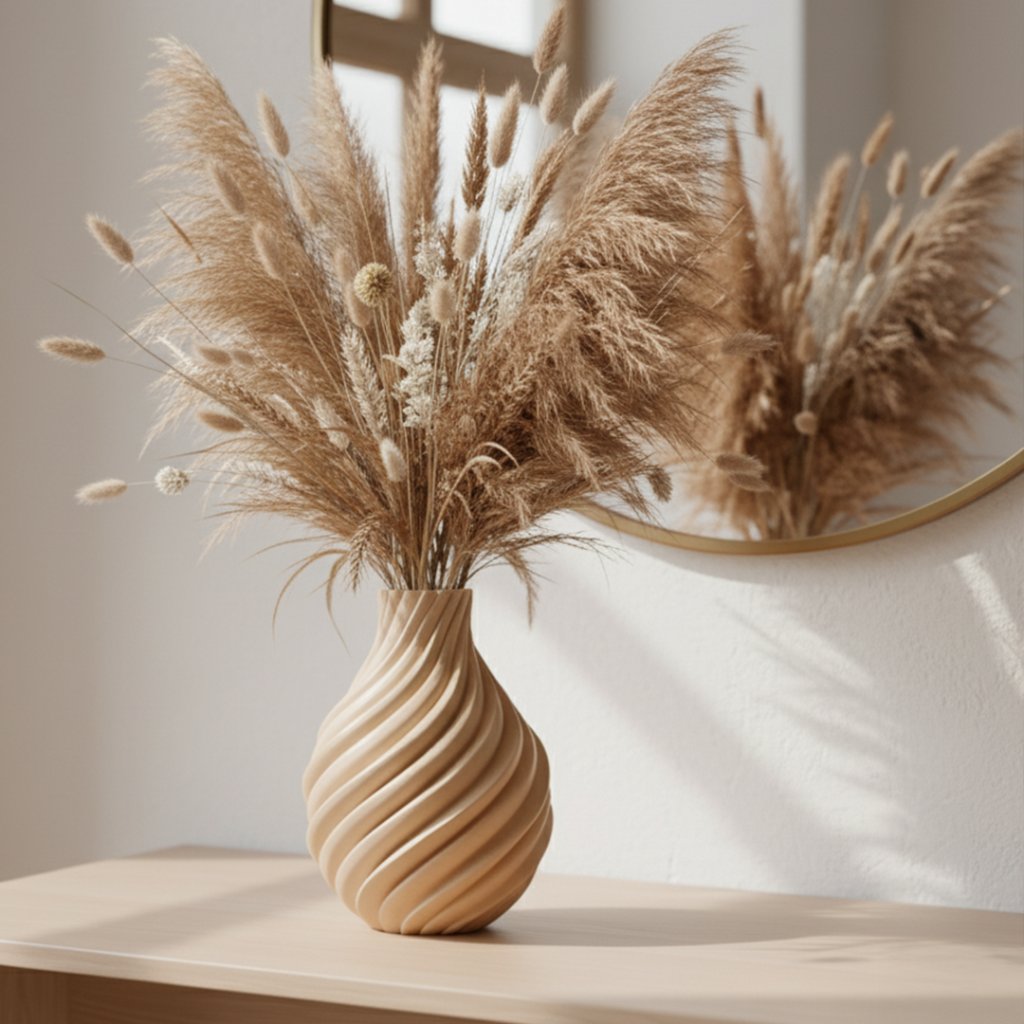 Váza Pillow Gold spojuje jemnost pohybu s moderní elegancí. Její bohatý, polštářový tvar se spirálovou strukturou působí měkce, ale zároveň výrazně. Ve světle zlatavém odstínu se stává dominantním, a přitom harmonickým prvkem každé místnosti.