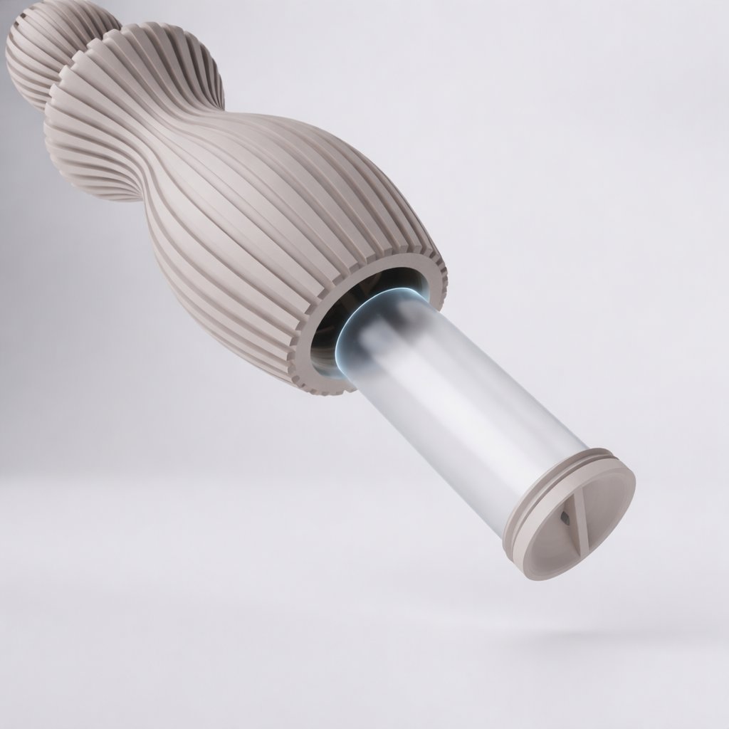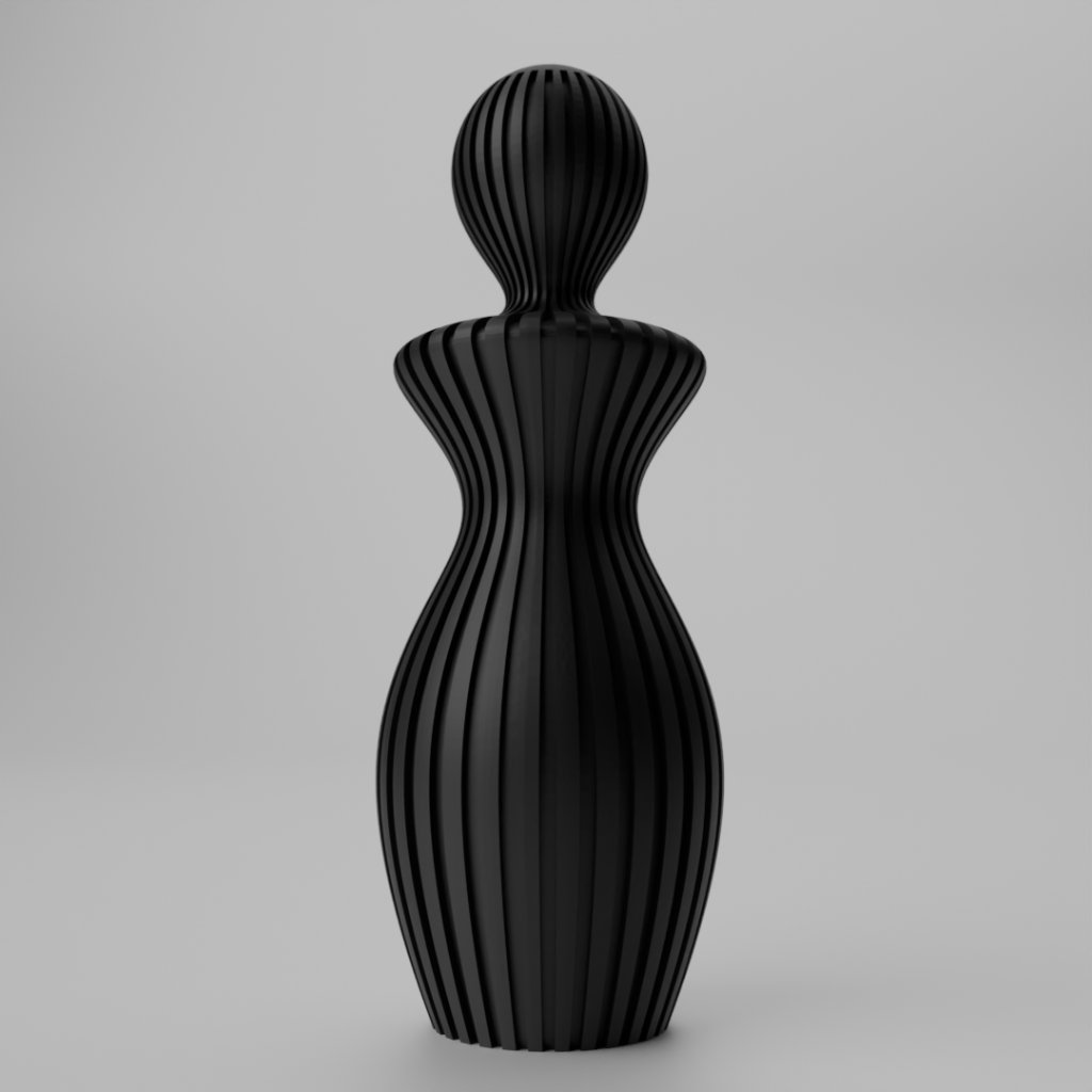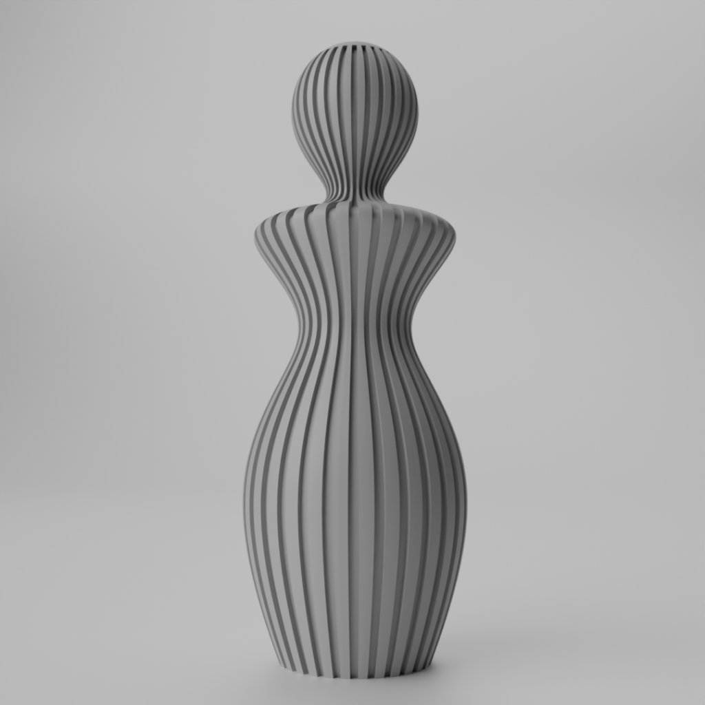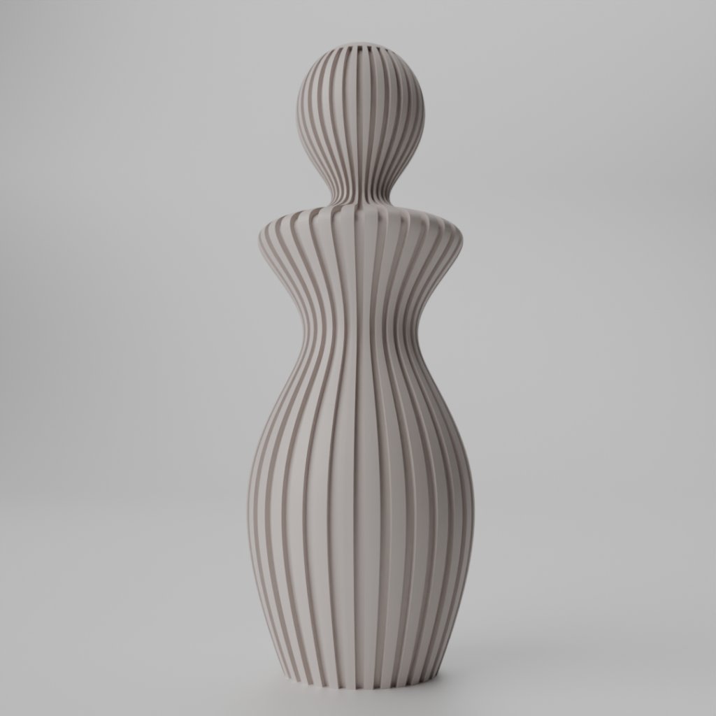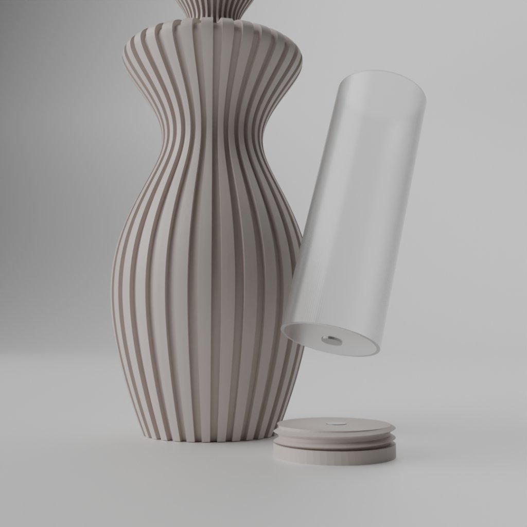 Charakteristický tvar vychádza z konceptu „postavička v postavičke“ – vnútorná forma je opticky vložená do vonkajšieho plášťa, čo vytvára jemnú hru svetla, tieňa a vertikálnych línií.