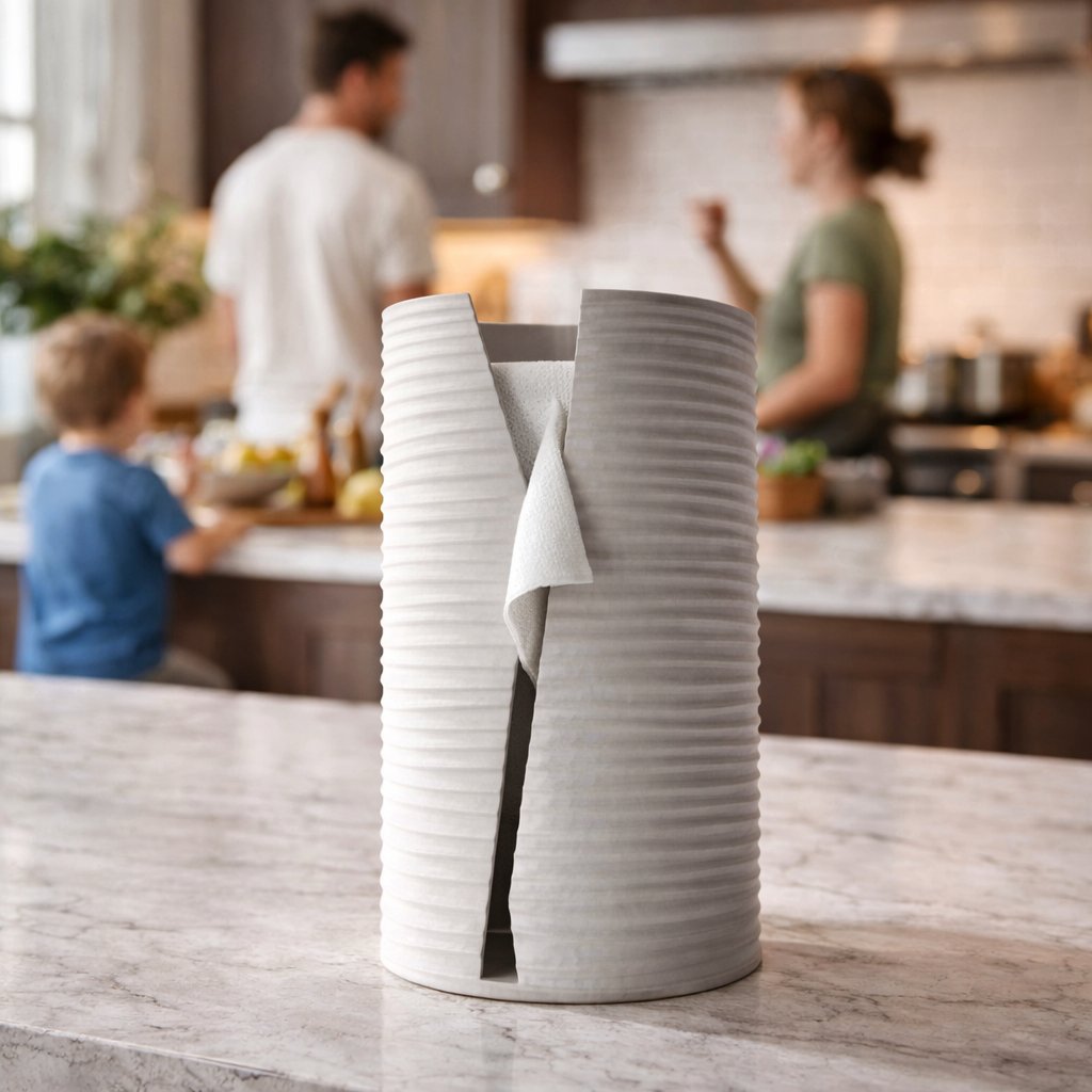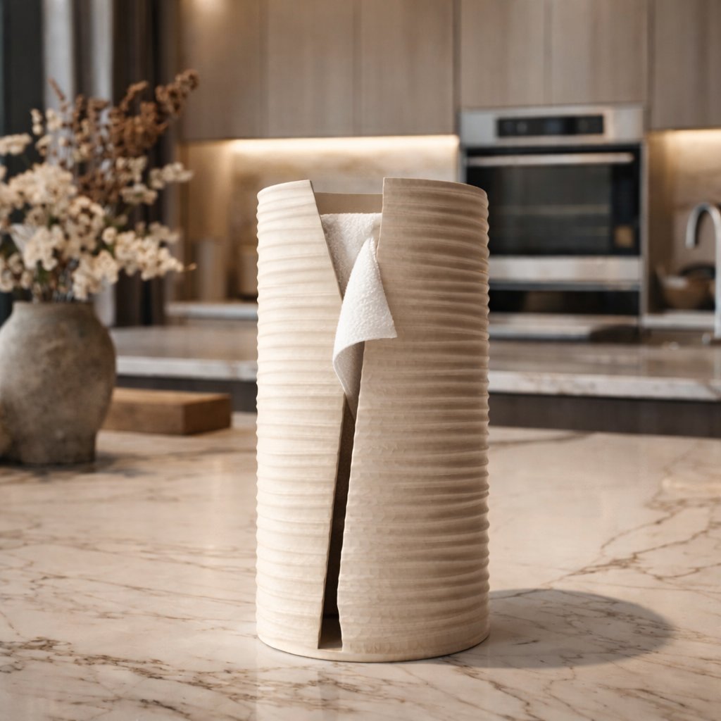 Rebrovaný povrch dodáva objektu hĺbku a prirodzenú textúru, zatiaľ čo stabilná valcová konštrukcia zabezpečuje pohodlné používanie bez prevracania pri odtrhávaní utierok.