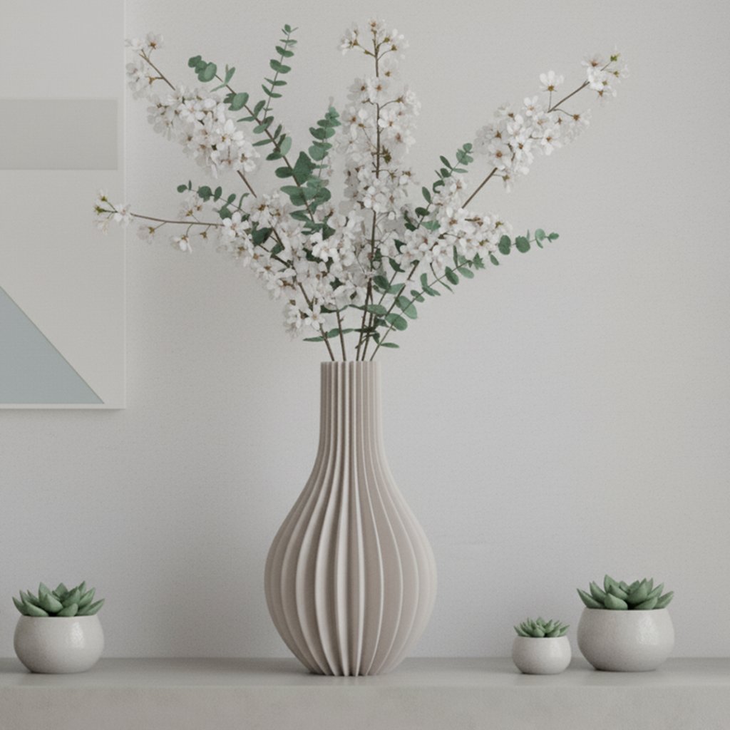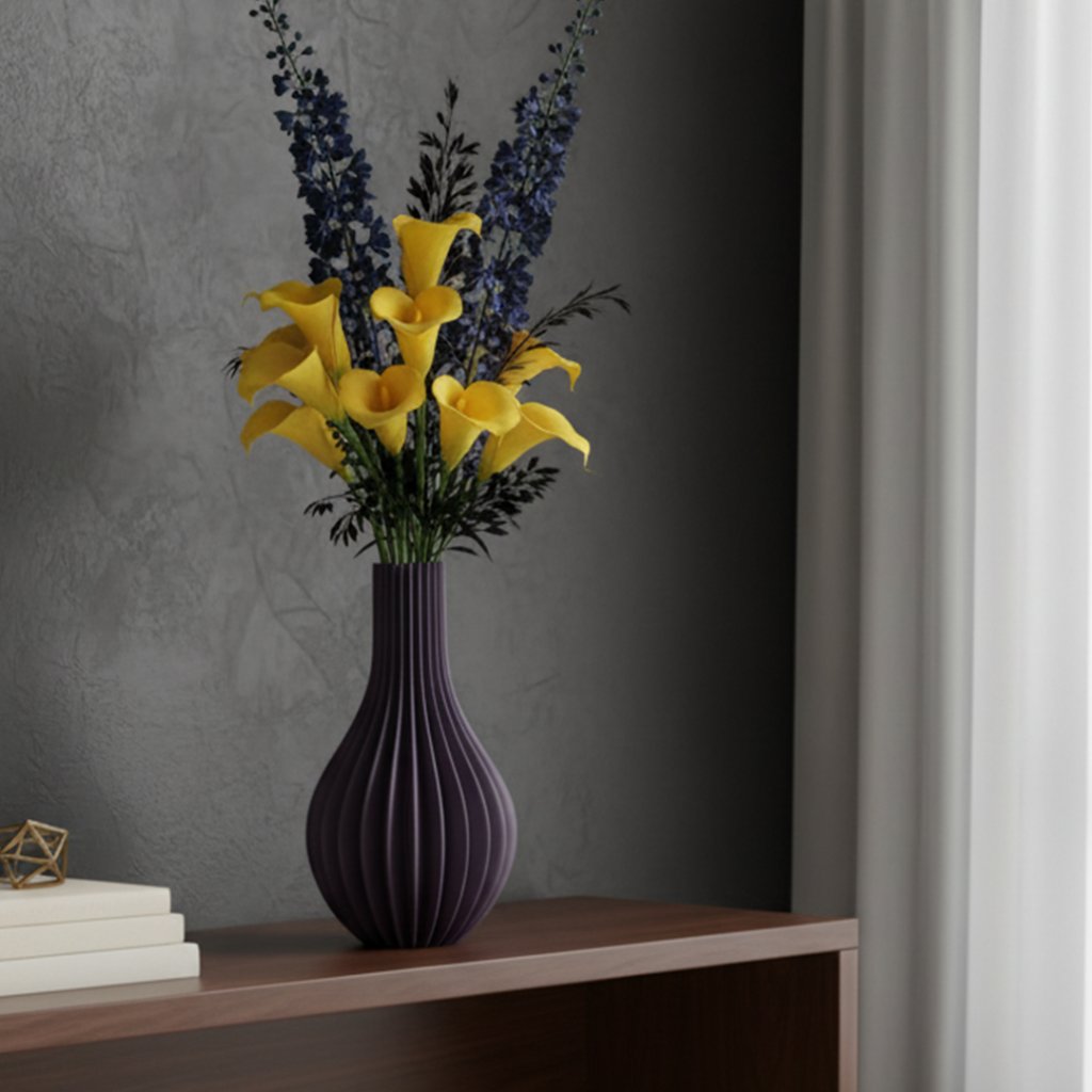 - Silný vizuálny efekt: hra svetla a tieňa na vertikálnych líniách robí z vázy prirodzené centrum pozornosti.