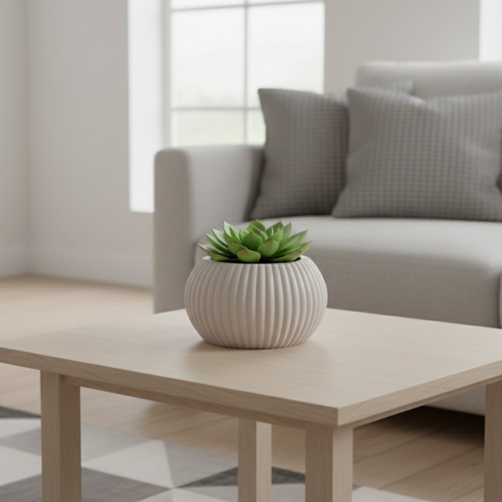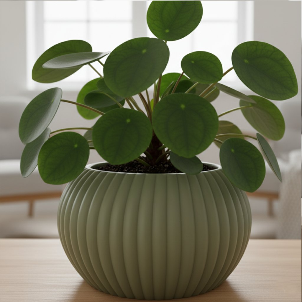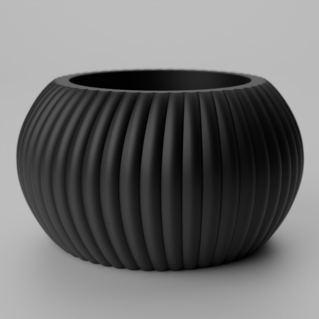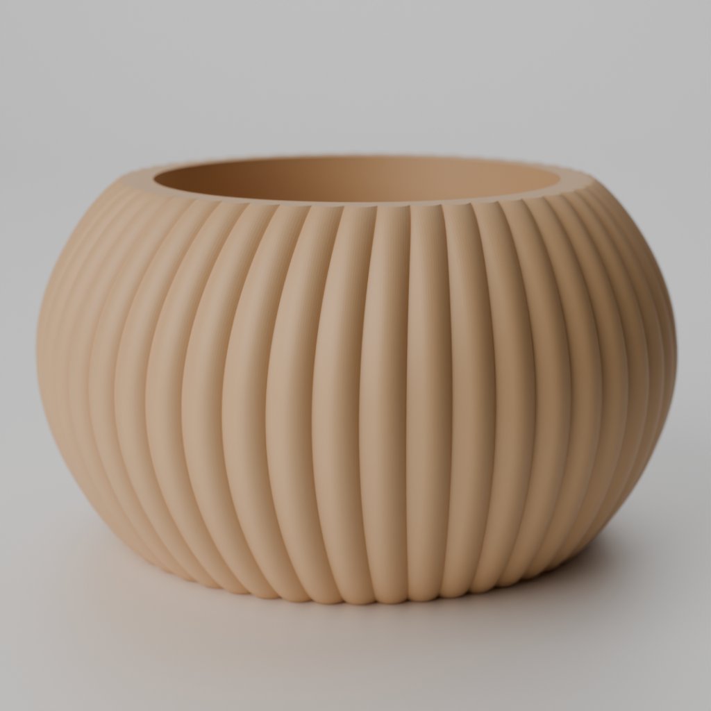 Roni je nadčasový kúsok s pravidelným vertikálnym rebrovaním (fluting), ktoré obopína jeho oblý korpus. Matný povrch a rovnomerné drážky vytvárajú čistú hru svetla a tieňa – ideálny akcent do interiéru aj exteriéru.