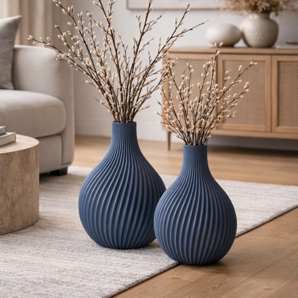 Obsidia Floor Set je výrazný set dvoch moderných dizajnových váz vo veľkostiach 240 mm a 280 mm. Ide o dominantnú kombináciu, ktorá prirodzene vytvorí silný vizuálny bod v interiéri – pri kresle, v rohu miestnosti alebo pri vstupnom priestore.