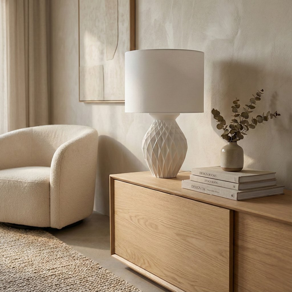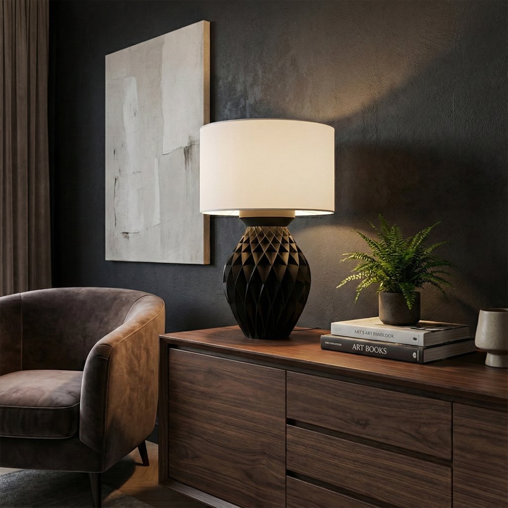 Lampa Konio zaujme výraznou plastickou štruktúrou, ktorá kombinuje geometrický 3D povrch s elegantnou siluetou tela. Je navrhnutá ako dizajnový solitér, ktorý prirodzene vynikne v modernom aj nadčasovom interiéri a dodá priestoru vizuálnu hĺbku.