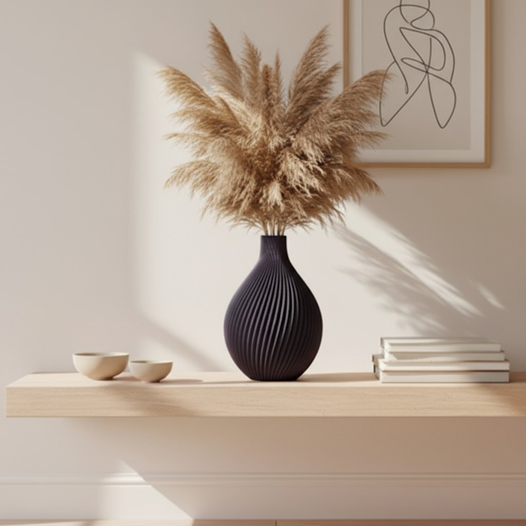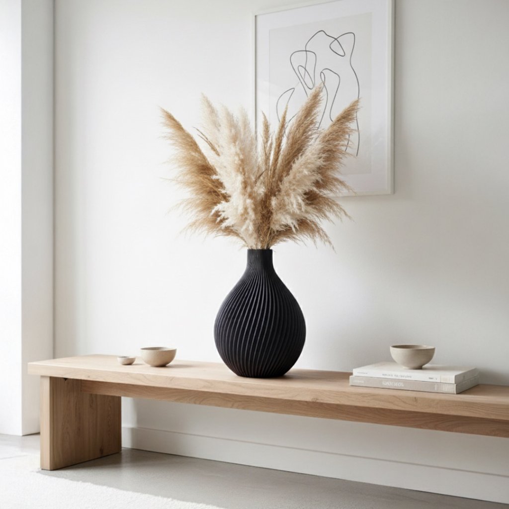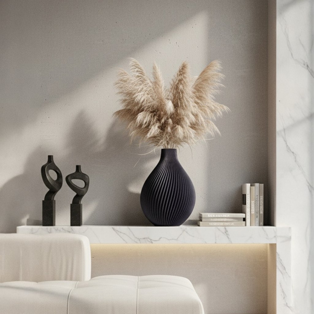 Matný povrch v hlbokom, sýtom odtieni dodáva Obsidii výnimočný prémiový charakter. Perfektne zapadne do moderného interiéru, kde sa stane dominantným solitérom na komode, konzole či poličke. V kombinácii s pampovou trávou, sušenými kvetmi alebo minimalistickými vetvičkami vytvára atmosféru galérie súčasného dizajnu.